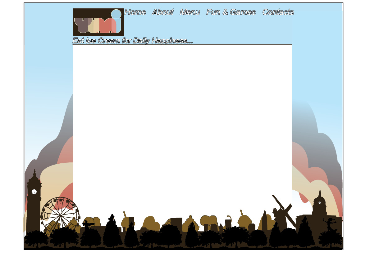 We developed a few basic mock ups to give us a starting point based upon the idea that YUMi is the only ice cream parlour in Nottingham. We thought a drawn city at the bottom of the content would flow nicely and allow the viewer to get a sense of where, why and what yumi's is. We worked with different colours for the background but the light blue worked out the best as it reflects that logos colour and gives the general site a positive feel.